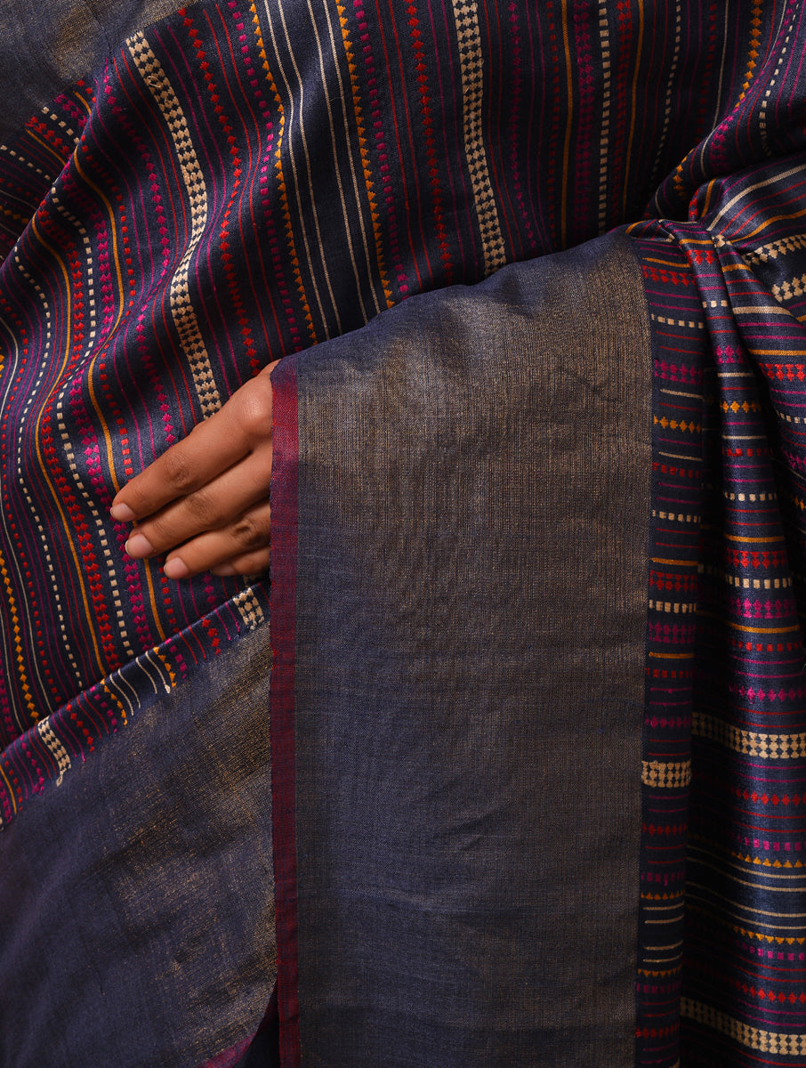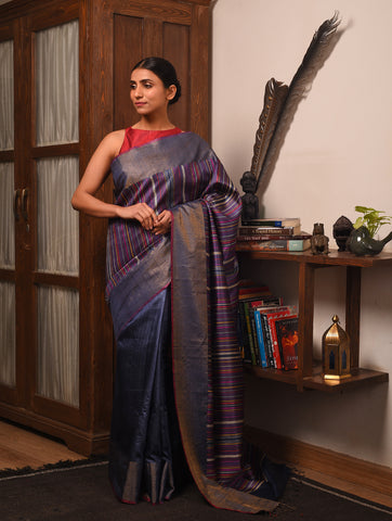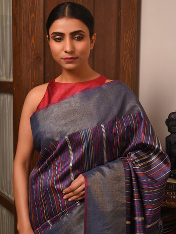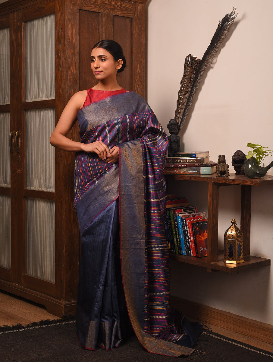 BEEJ Long Pallu Handwoven Tussar Silk Saree - Indigo Blue