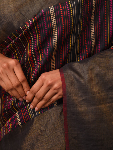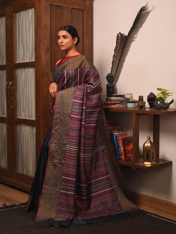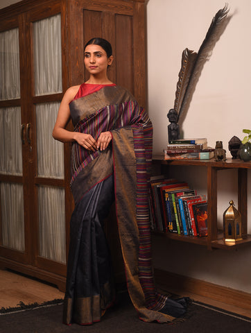 BEEJ Long Pallu Handwoven Tussar Silk Saree - Charcoal
