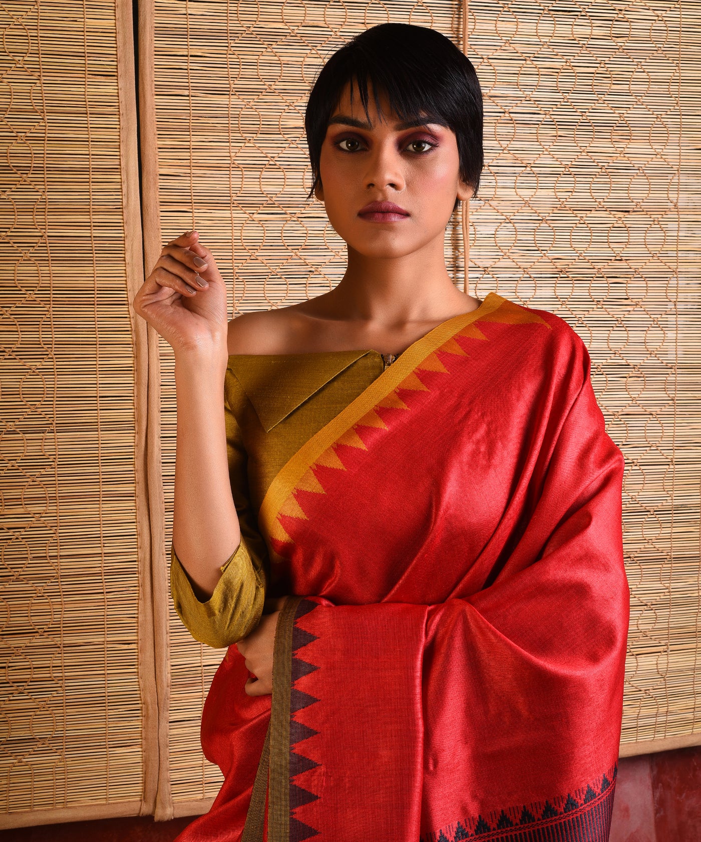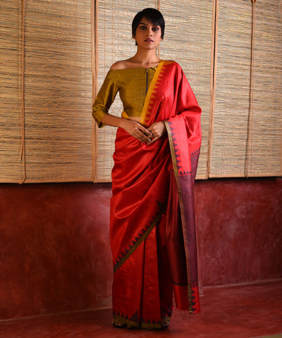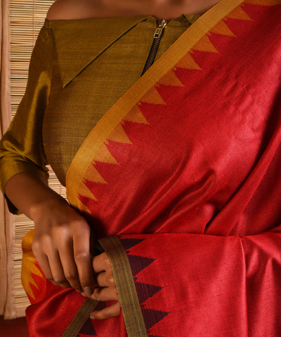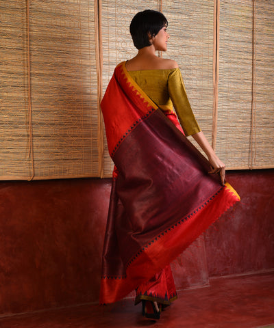 KUMBHA Handwoven Tussar Silk Saree - Red Black