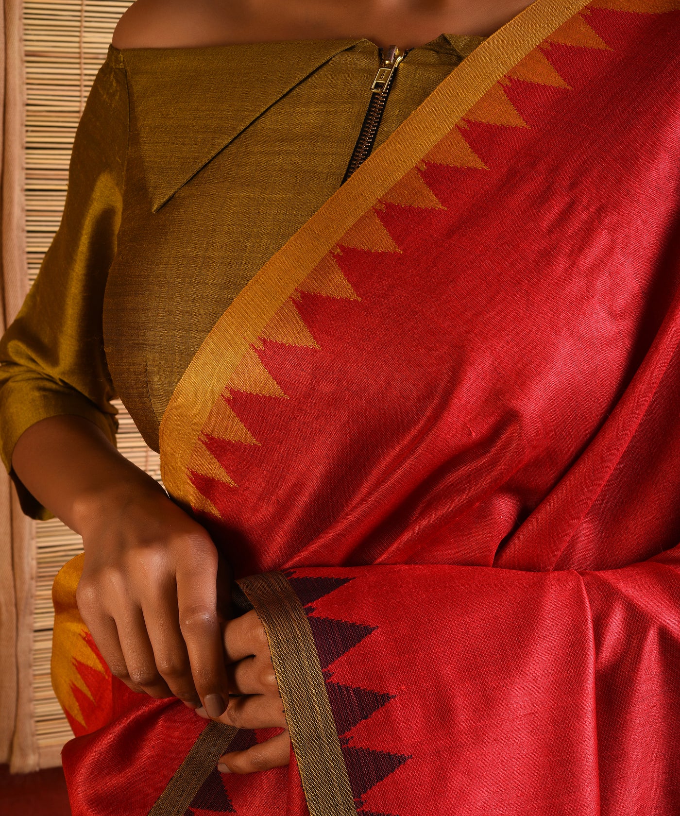 The classic Kumbha temple border gets a new form and design in a Ganga Jamuna colour palette. Kumbha means Kalash, a pitcher. The reference is to the pot which emerged after the gods and demons churned the milky ocean filled with the nectar of immortality. An overflowing pot of knowledge, happiness and bliss. The other reference to Kumbha is the sign of the Aquarius wherein metaphorically, the 'Kumbha' border of a Sari signifies the continuity of life from celestial forces to the elements of our planet; of water from the verdant hills to the oceans; of wisdom from one civilisation to another.