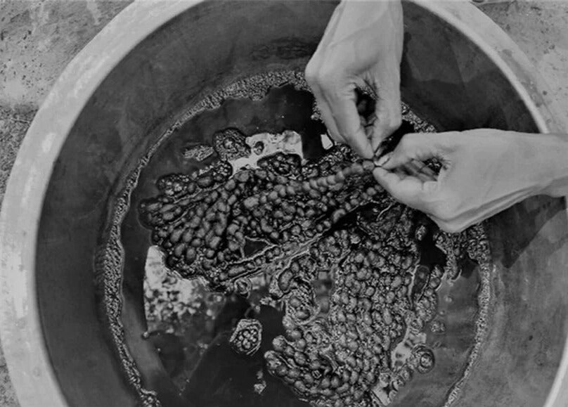 The process of creating Ikat follows a series of steps. The technique requires the yarns to be tied and dyed repeatedly in accordance to the design to bring about the desired colours at the desired places and ultimately with the simple interlacement of the threads the design is produced on the fabric. There are many hidden processes involved before and after the sari is born on the loom. Such an elaborate process employs entire families dedicated to weaving a single ikat sari.
