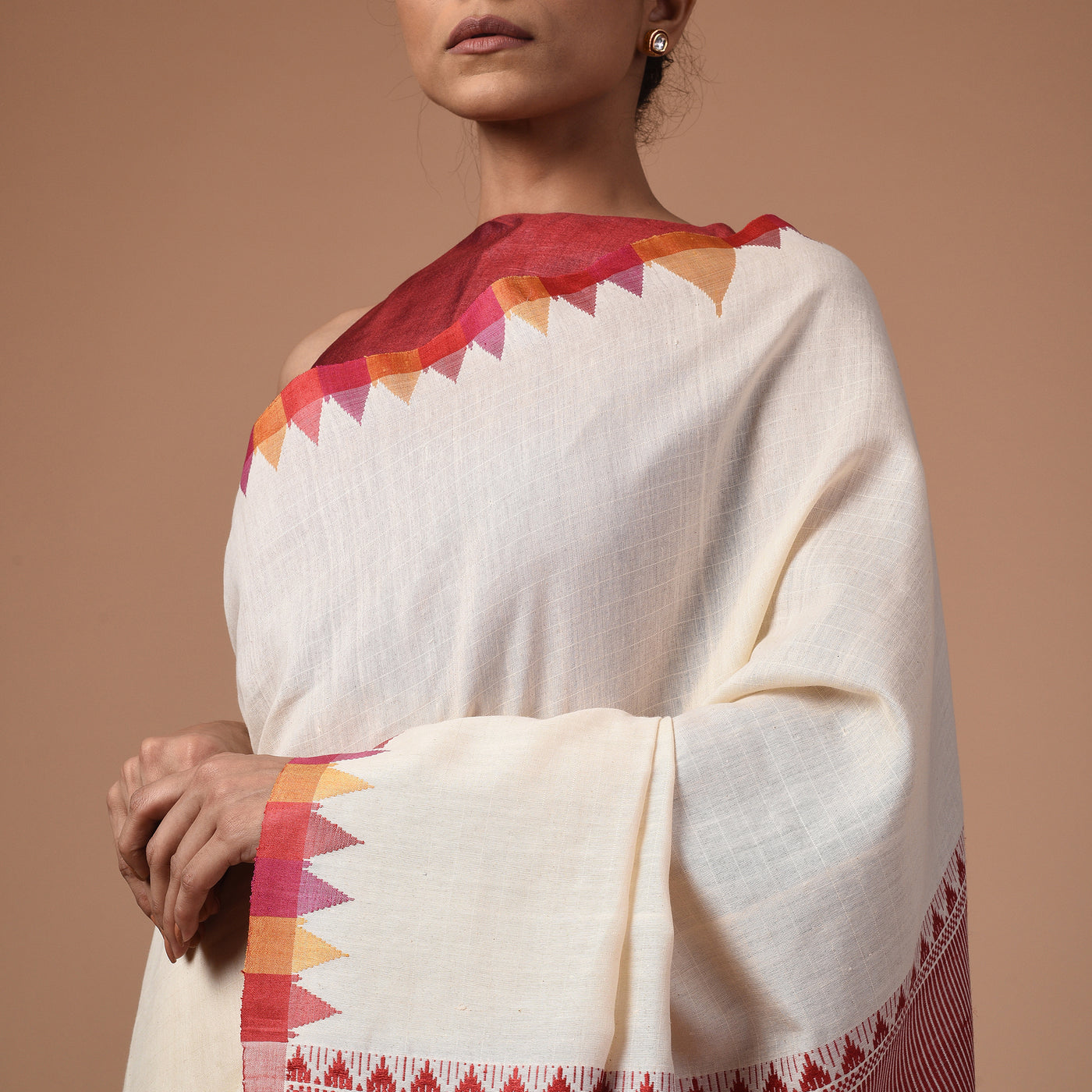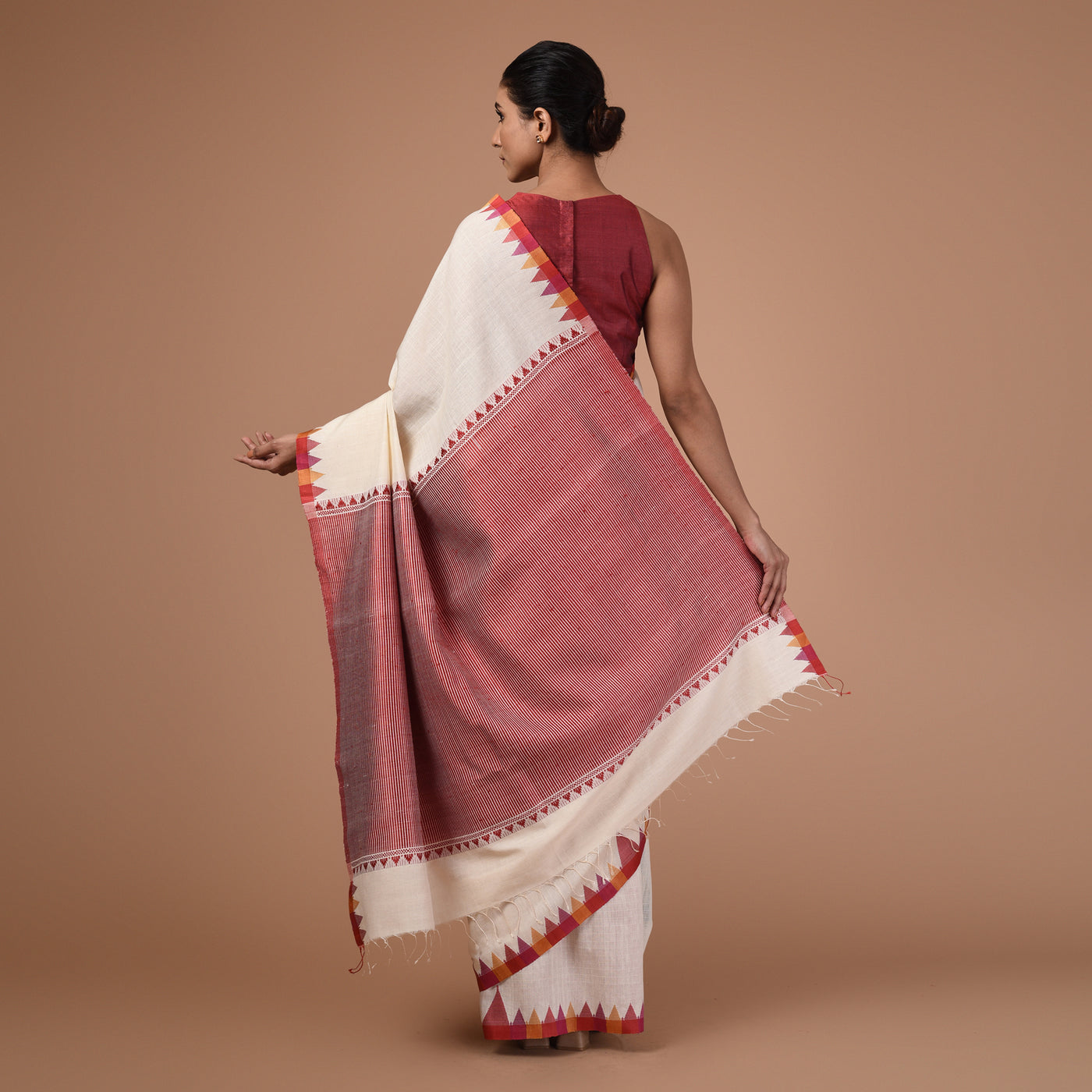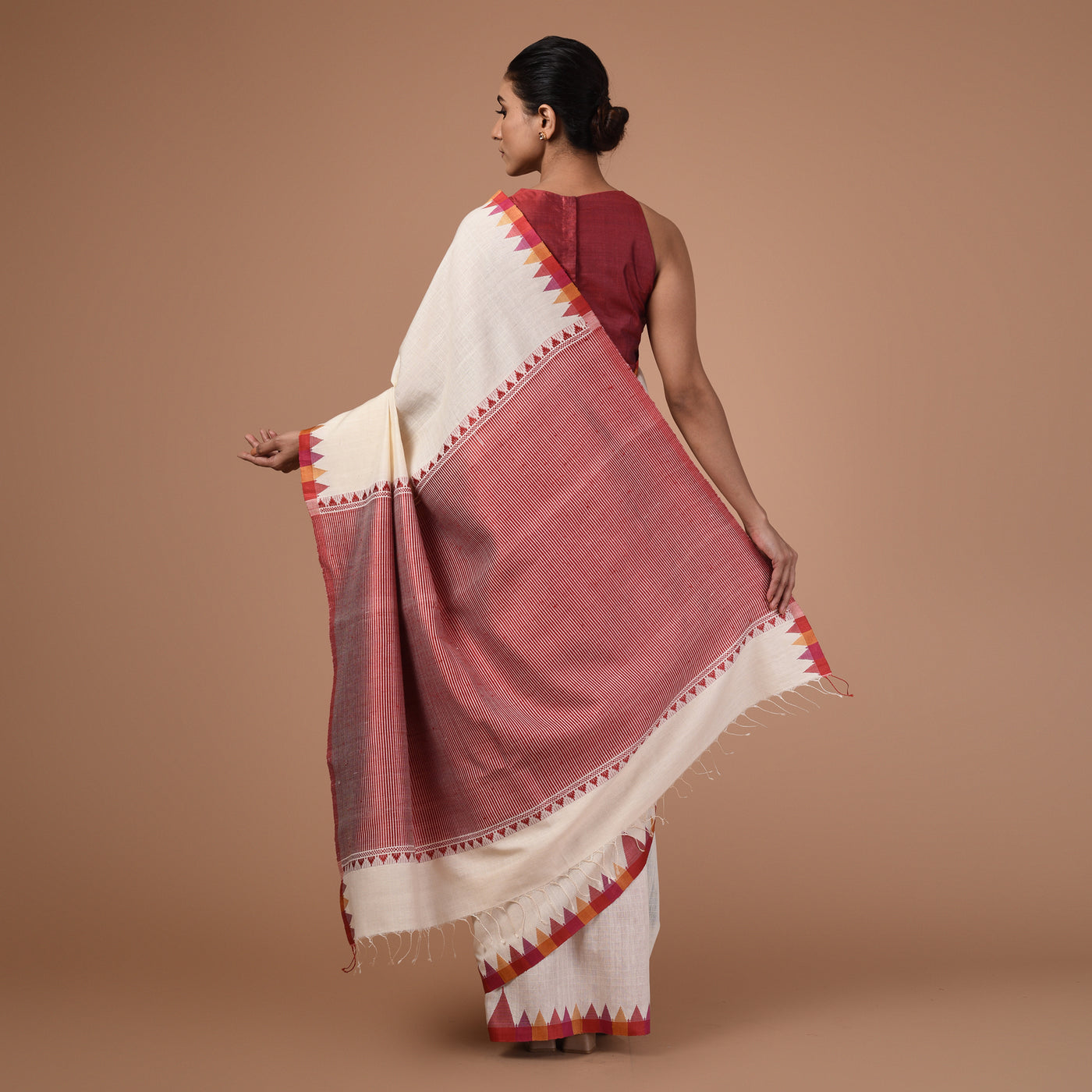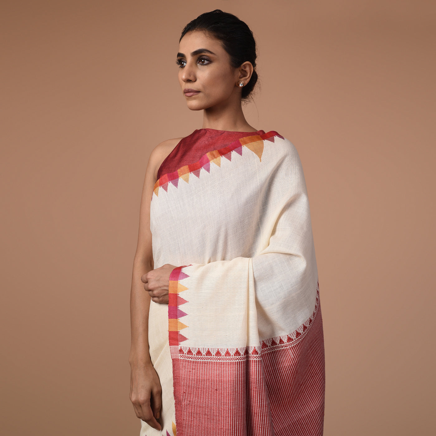 DESI KUMBHA Tussar/Cotton Handwoven Saree - Ivory Multicolor Border