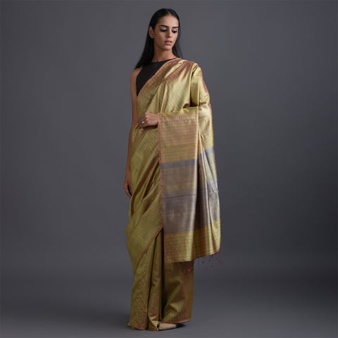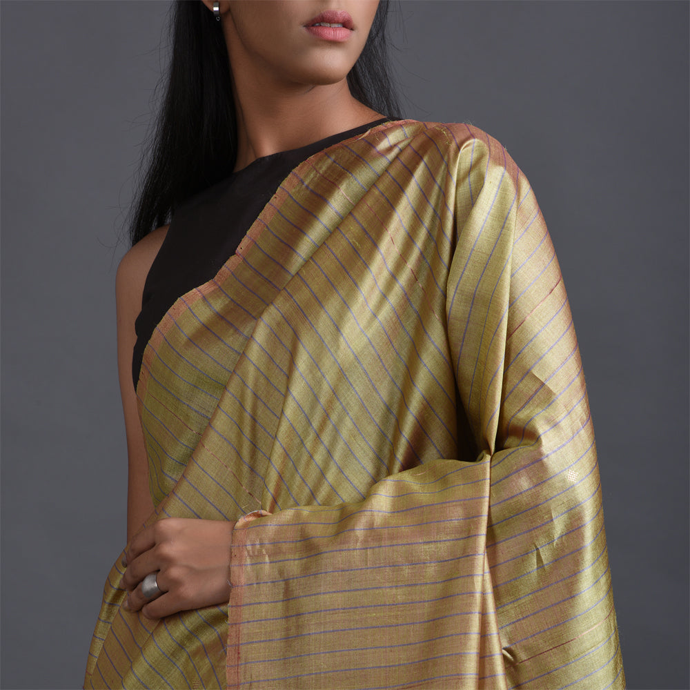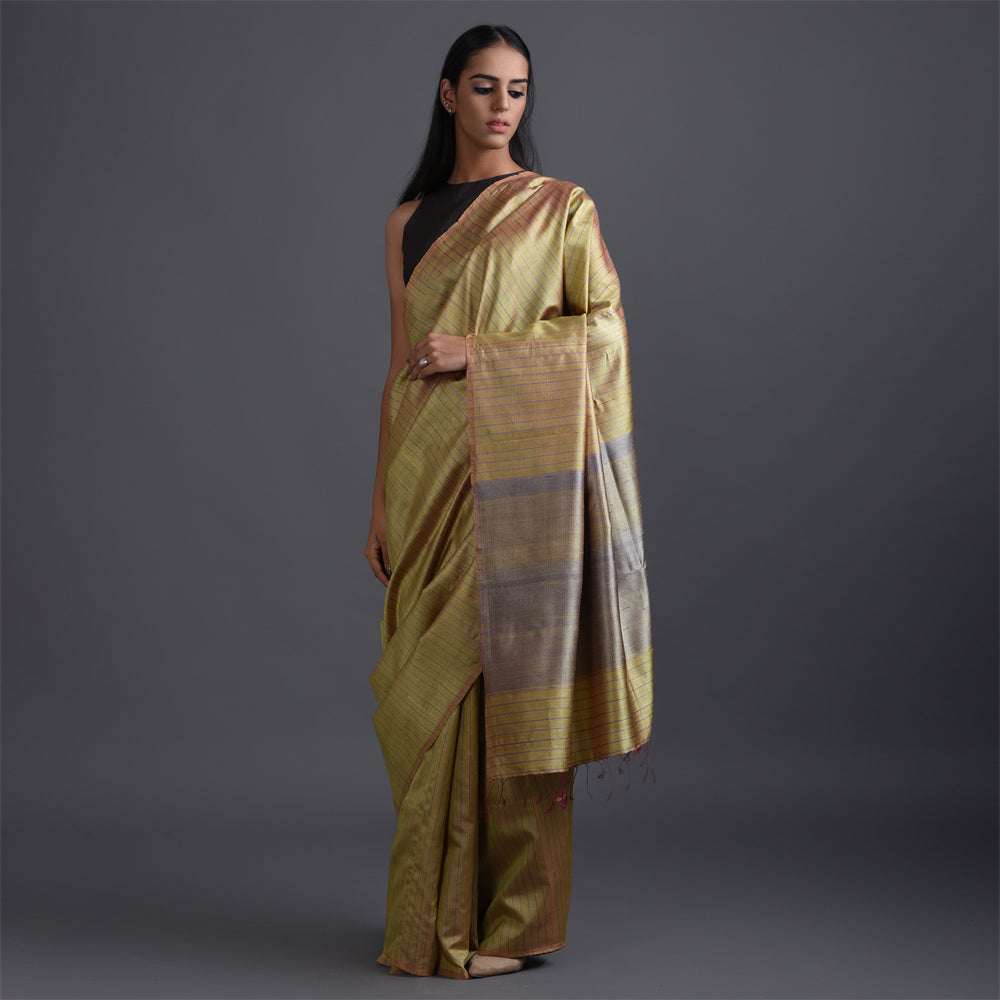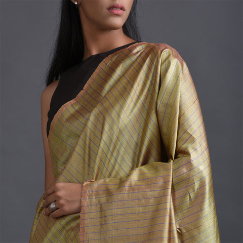 Zari Stripe Handwoven Tussar Silk Saree - Butterscotch Green