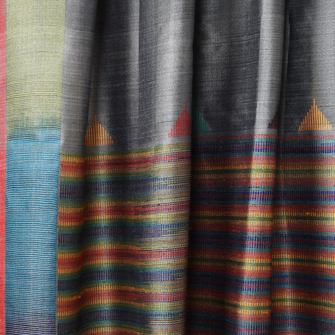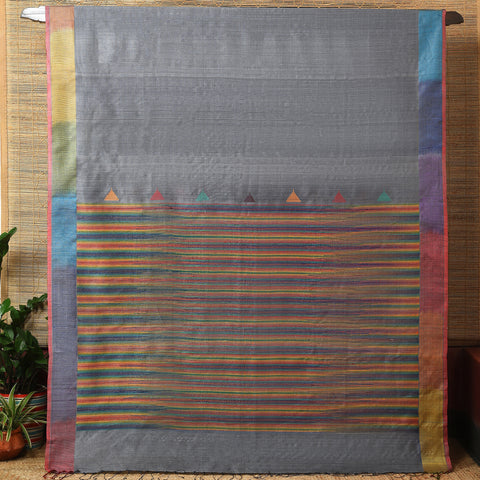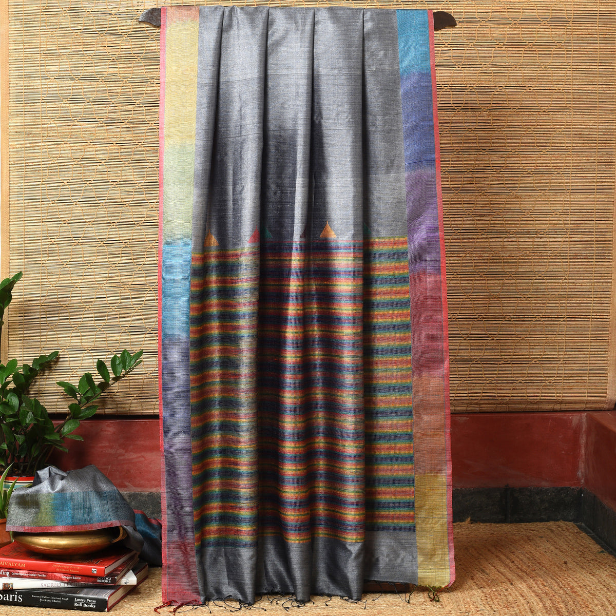 Ikat Tussar Satrang Silk Sari - Steel Grey