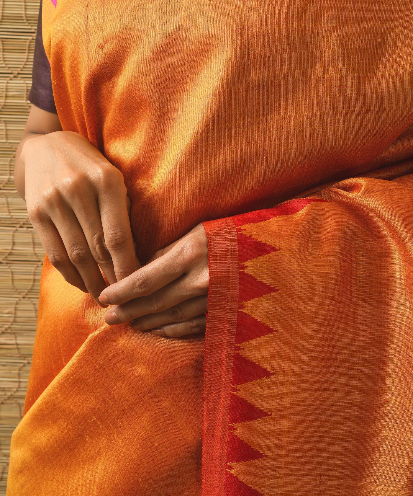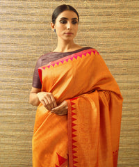 The classic Kumbha temple border gets a new form and design in a Ganga Jamuna colour palette. Kumbha means Kalash, a pitcher. The reference is to the pot which emerged after the gods and demons churned the milky ocean filled with the nectar of immortality. An overflowing pot of knowledge, happiness and bliss. The other reference to Kumbha is the sign of the Aquarius wherein metaphorically, the 'Kumbha' border of a Sari signifies the continuity of life from celestial forces to the elements of our planet; of water from the verdant hills to the oceans; of wisdom from one civilisation to another.