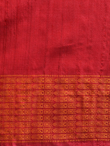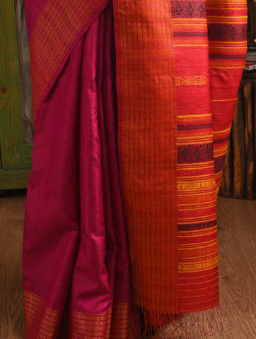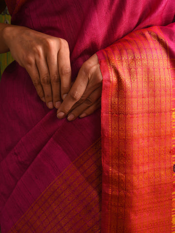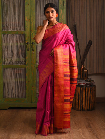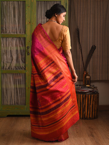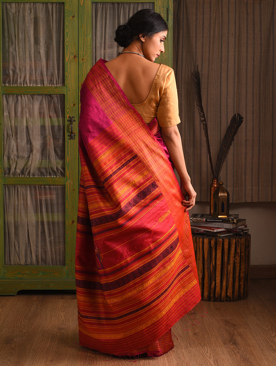 NAVAGUNJARA Handwoven Tussar Silk Saree - Ruby Pink