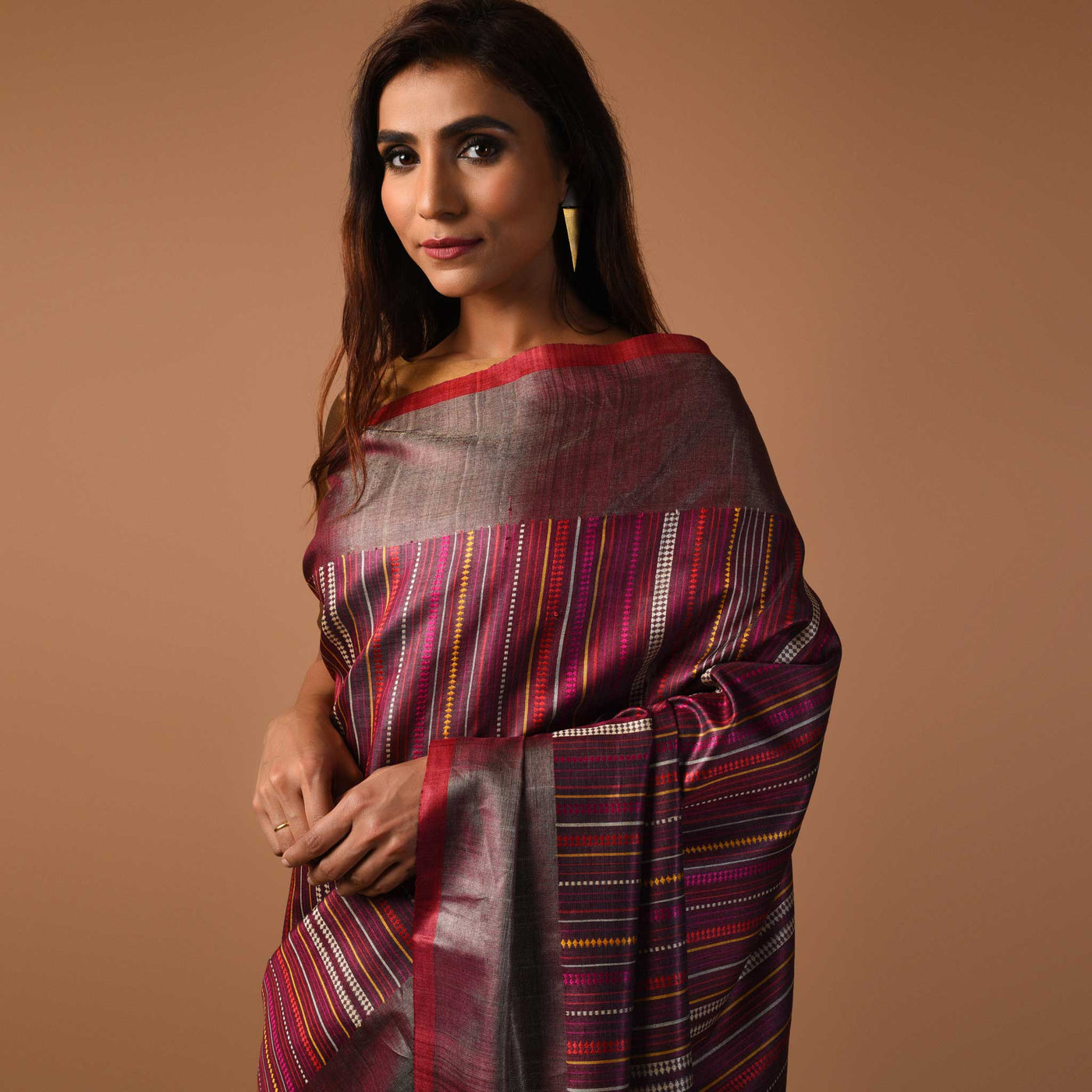 BEEJ Long Pallu Handwoven Tussar Silk Saree - Purple Maroon Sale